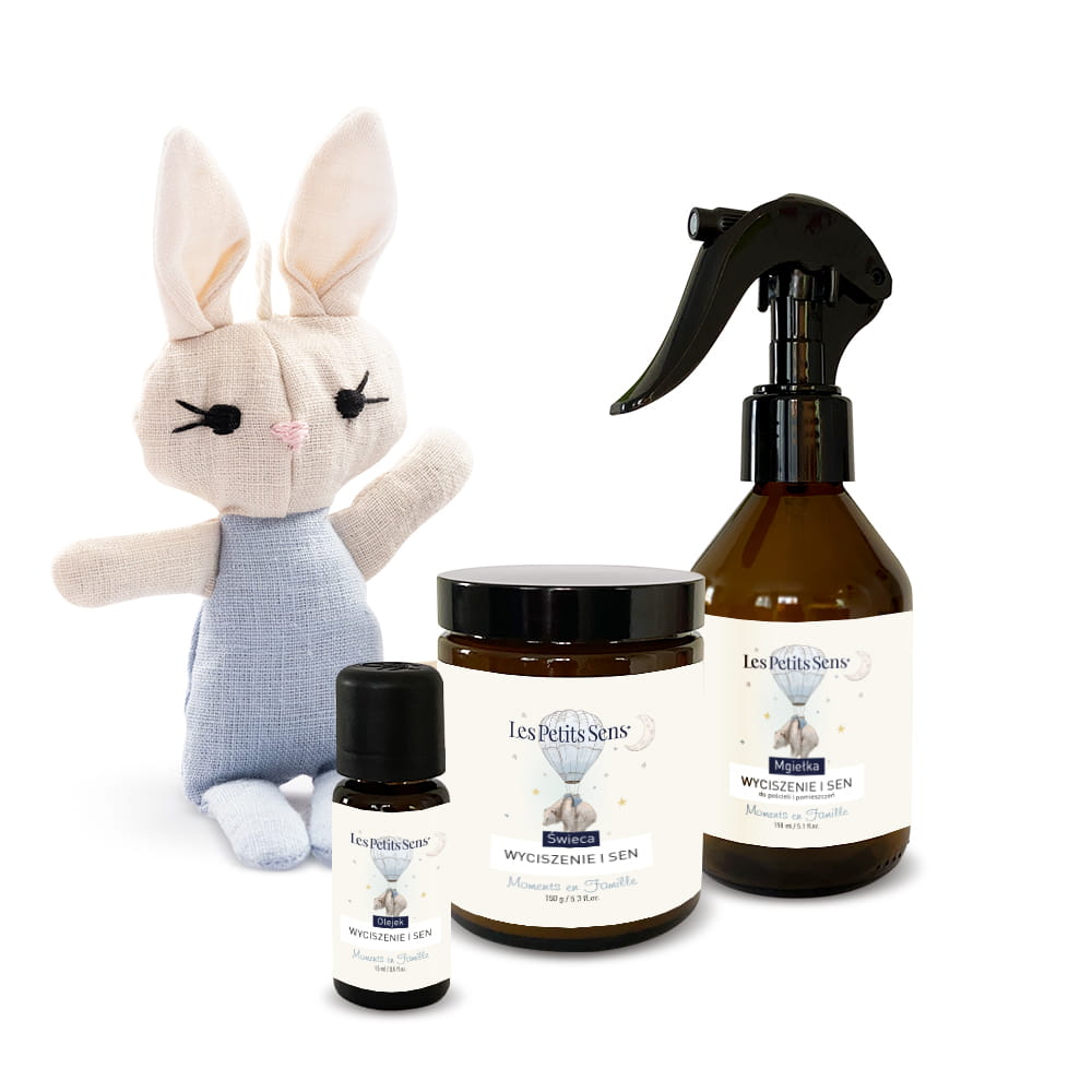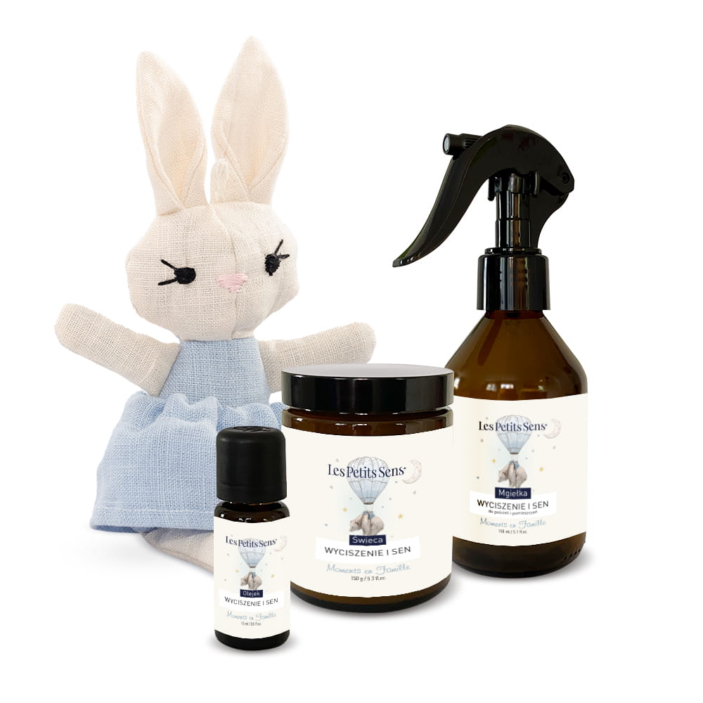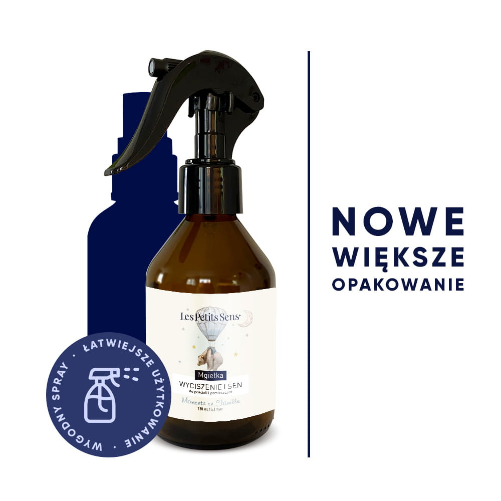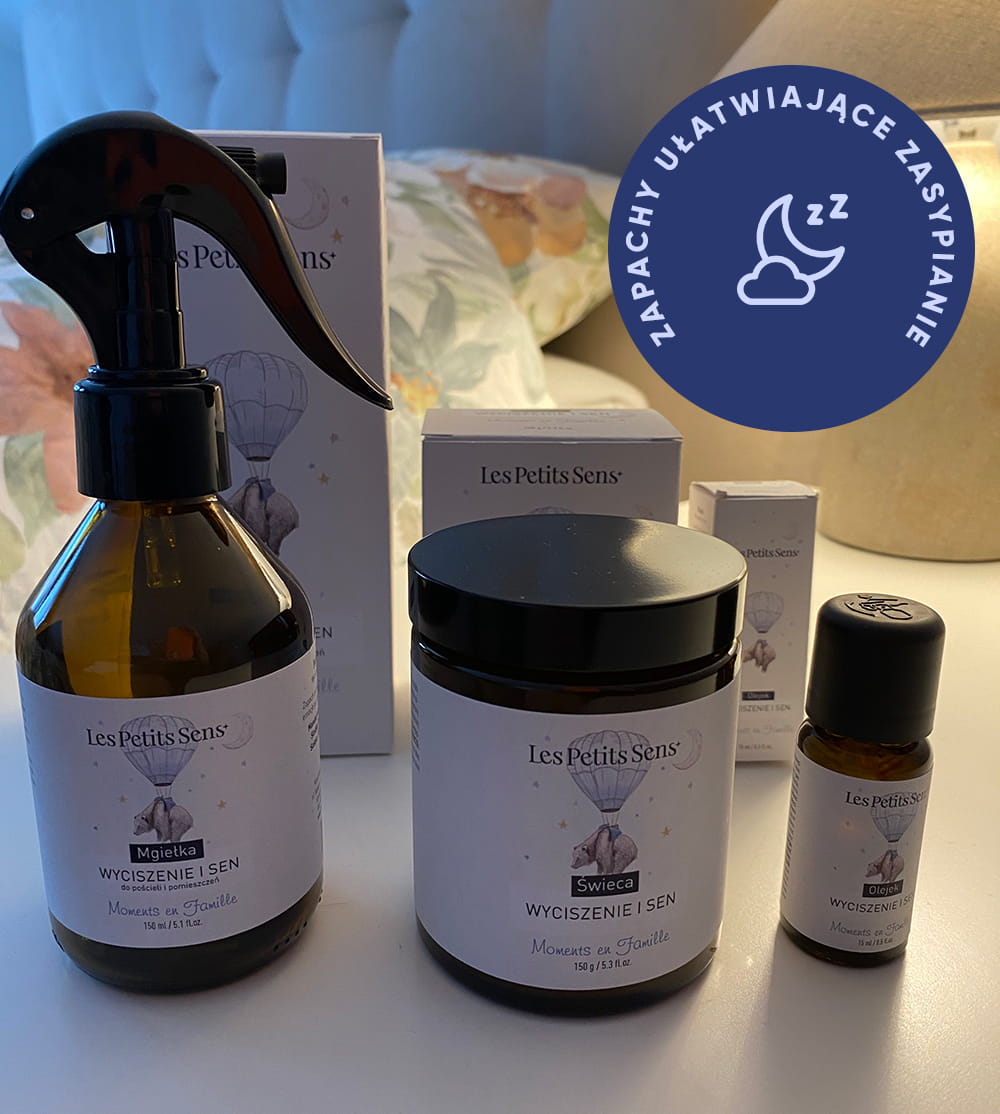 - Mgiełka Wyciszenie i Sen – do spryskiwania pościeli i pomieszczeń, zapewnia delikatny, kojący zapach na dobranoc.